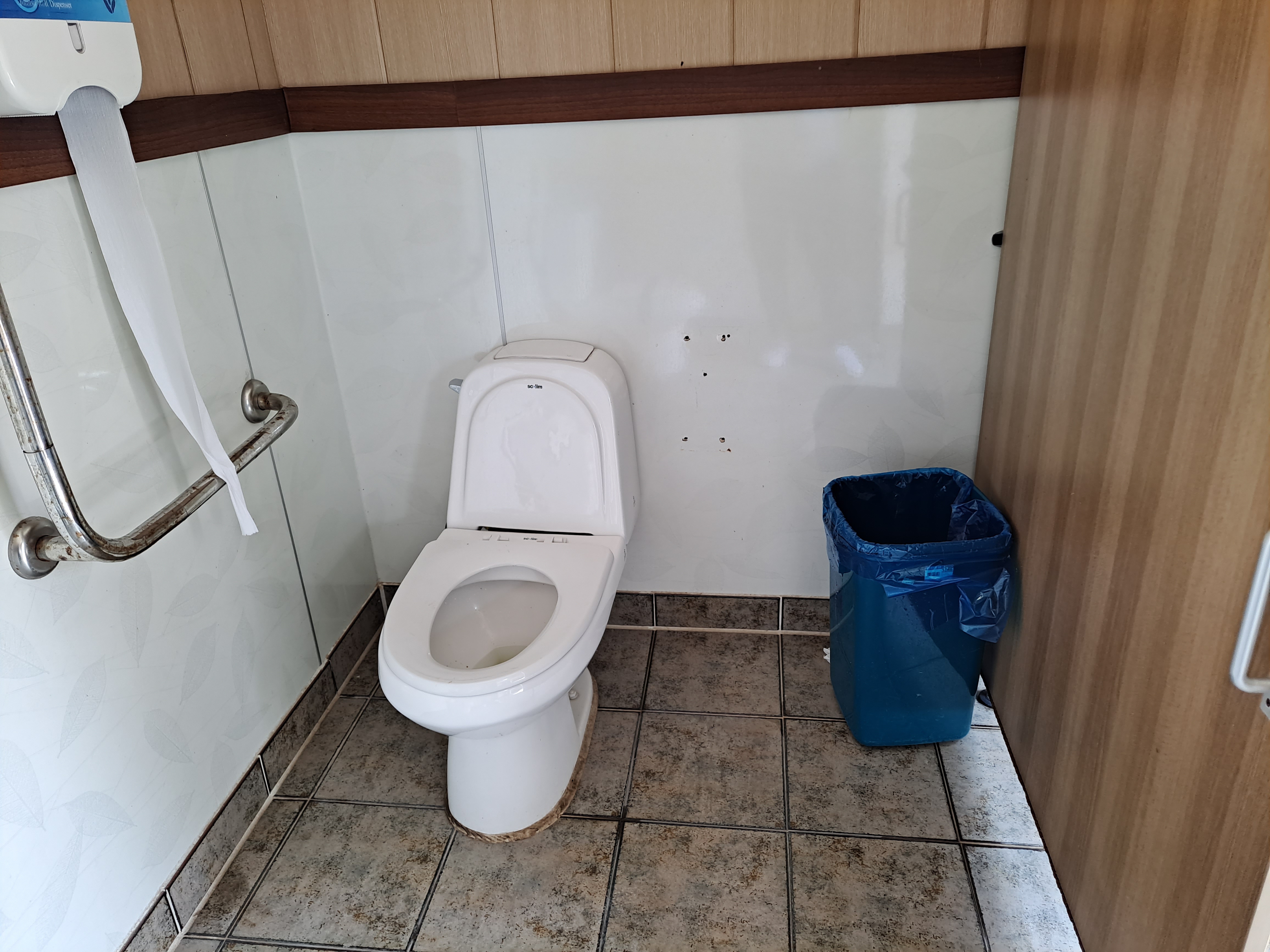 일반 화장실이지만 휠체어 회전 유효 폭이 넓고, 변기 주변에 안전바가 있어 휠체어 접근이 가능하다.